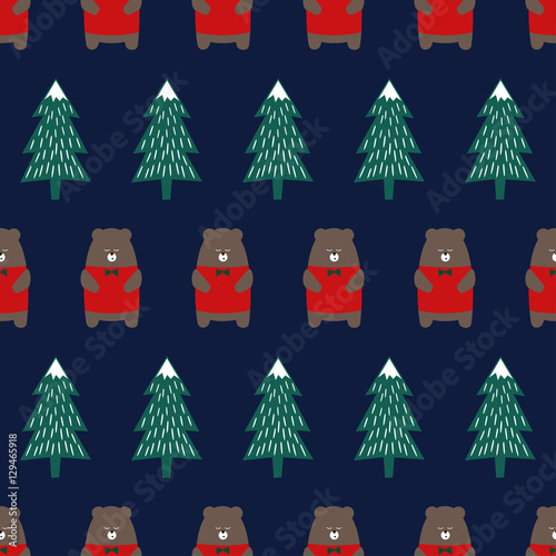 Cute Bear With Xmas Tree Seamless Pattern On Dark Blue