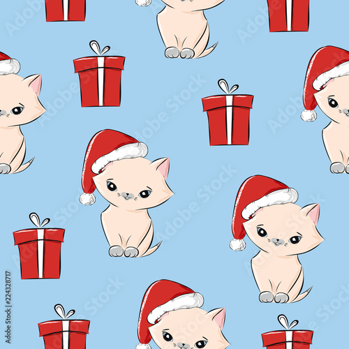 Cute Cartoon Cats With Christmas Gifts Vector Seamless