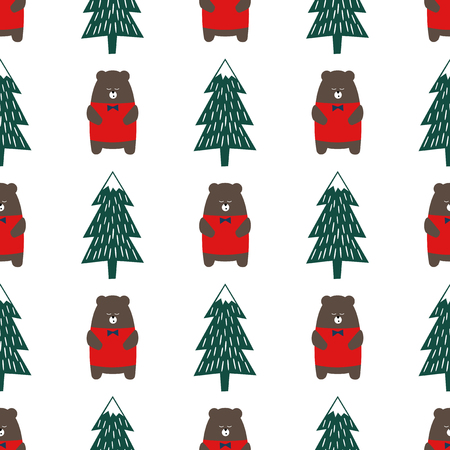 Cute Cartoon Bear And Xmas Tree Seamless Pattern Colorful