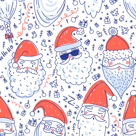Cute Seamless Pattern With Hipster Santa Heads On Blue Background For Christmas And New Year Designs And Packaging Clip Art