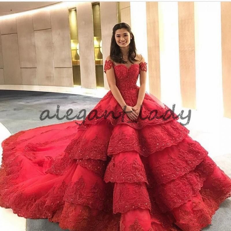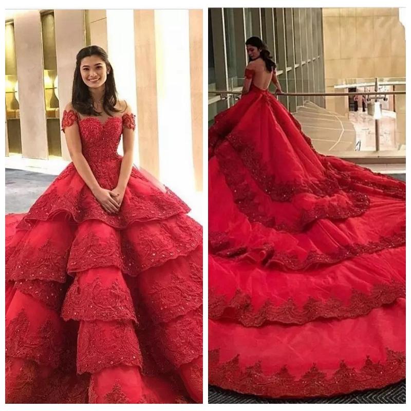Gorgeous Dubai Princess Engagement Dress Golden Lace Appliques Ball Gown Evening Dresses Fascinating Red Long Evening Gowns 2018 Prom Dress Elegant