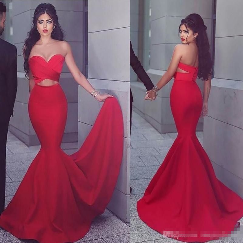 Sexy Fake Two Pieces Mermaid Prom Dresses New 2019 Sweetheart Tight Red Satin Evening Gowns Arabic Charming Trumpet Engagement Dress Cheap Gowns
