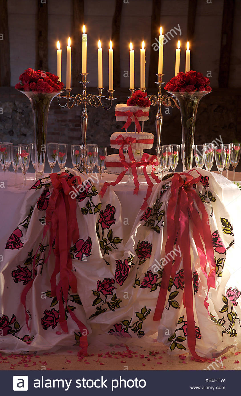 Silver Candelabra And Red Roses And Ribbons On Table With A