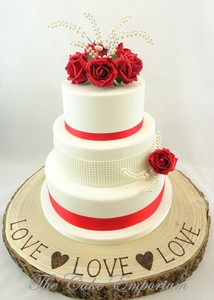 3 Tier Wedding Cake With Red Roses And Red Ribbon