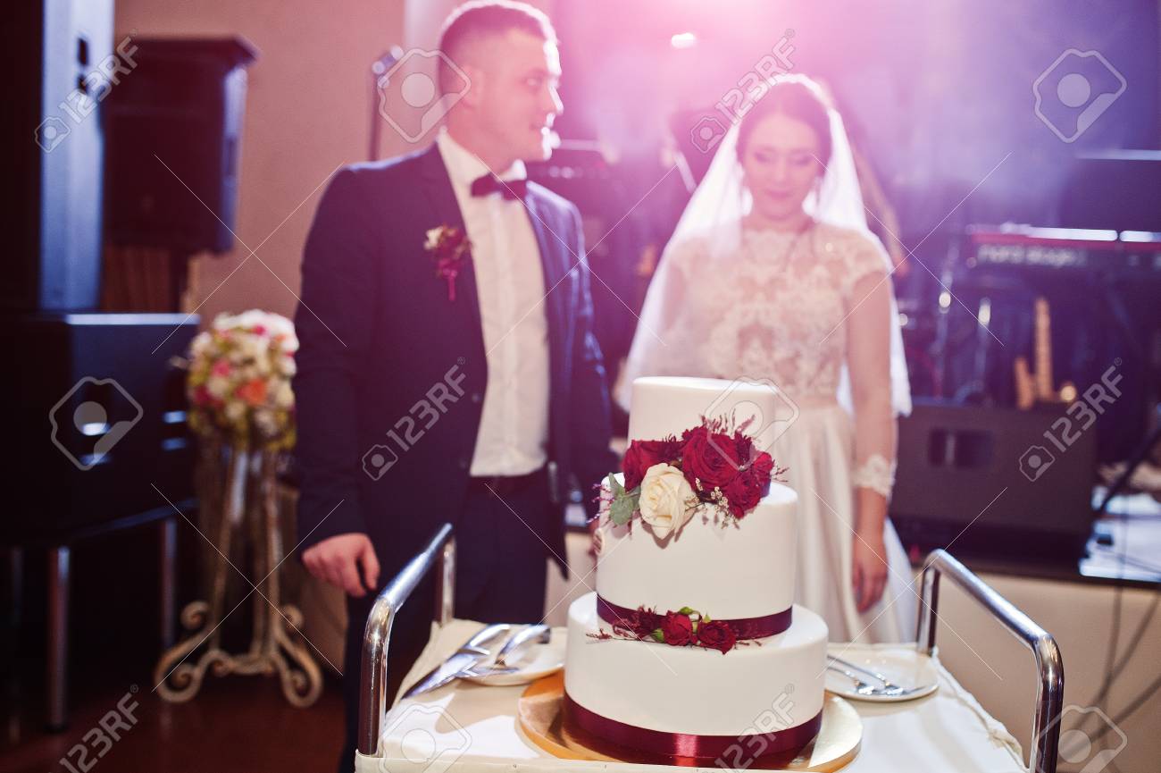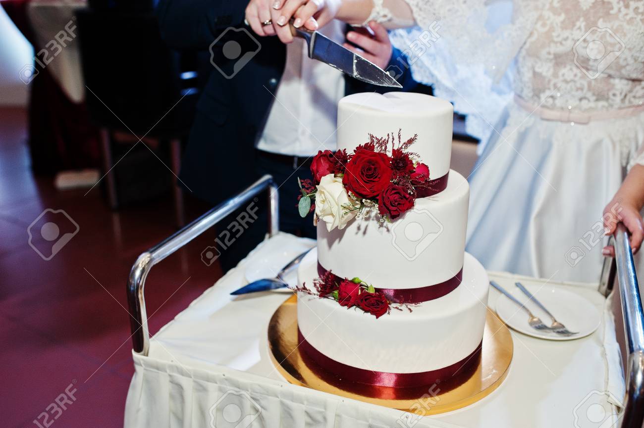 Wedding Couple Cut Wedding Cake With Red Roses And Ribbon